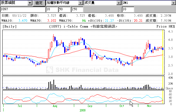 -DI) 時,便顯示買入的訊號;相反地,當上升指標 (+ DI) 從上向下穿破下降指標 (- DI) 時,則顯示賣出的訊號。上圖為“有線寬頻通訊”於二千年七月至十一月期間的動向指數,而這隻股份於這段期間的市場交易跟上述的投資策略亦很吻合。